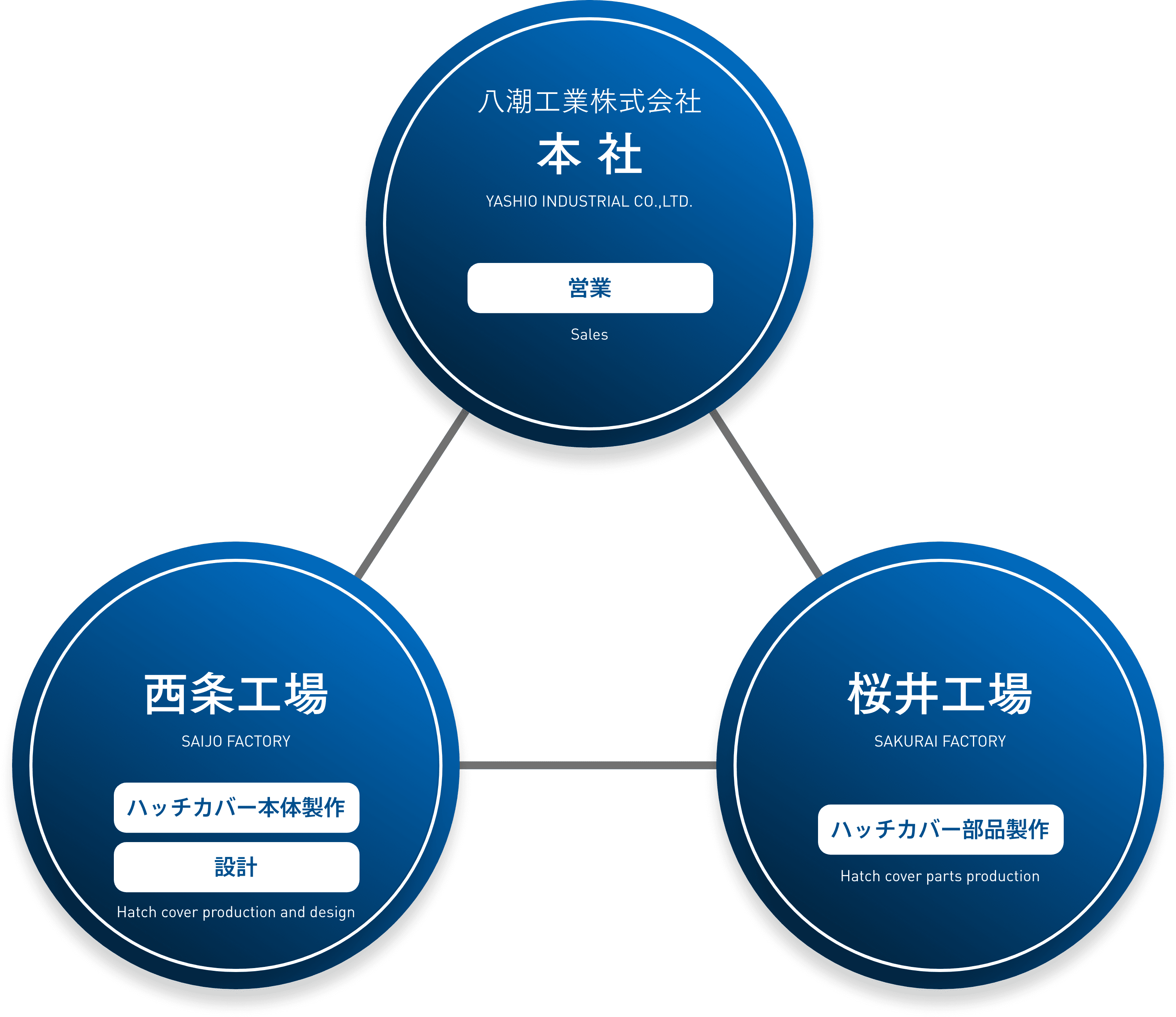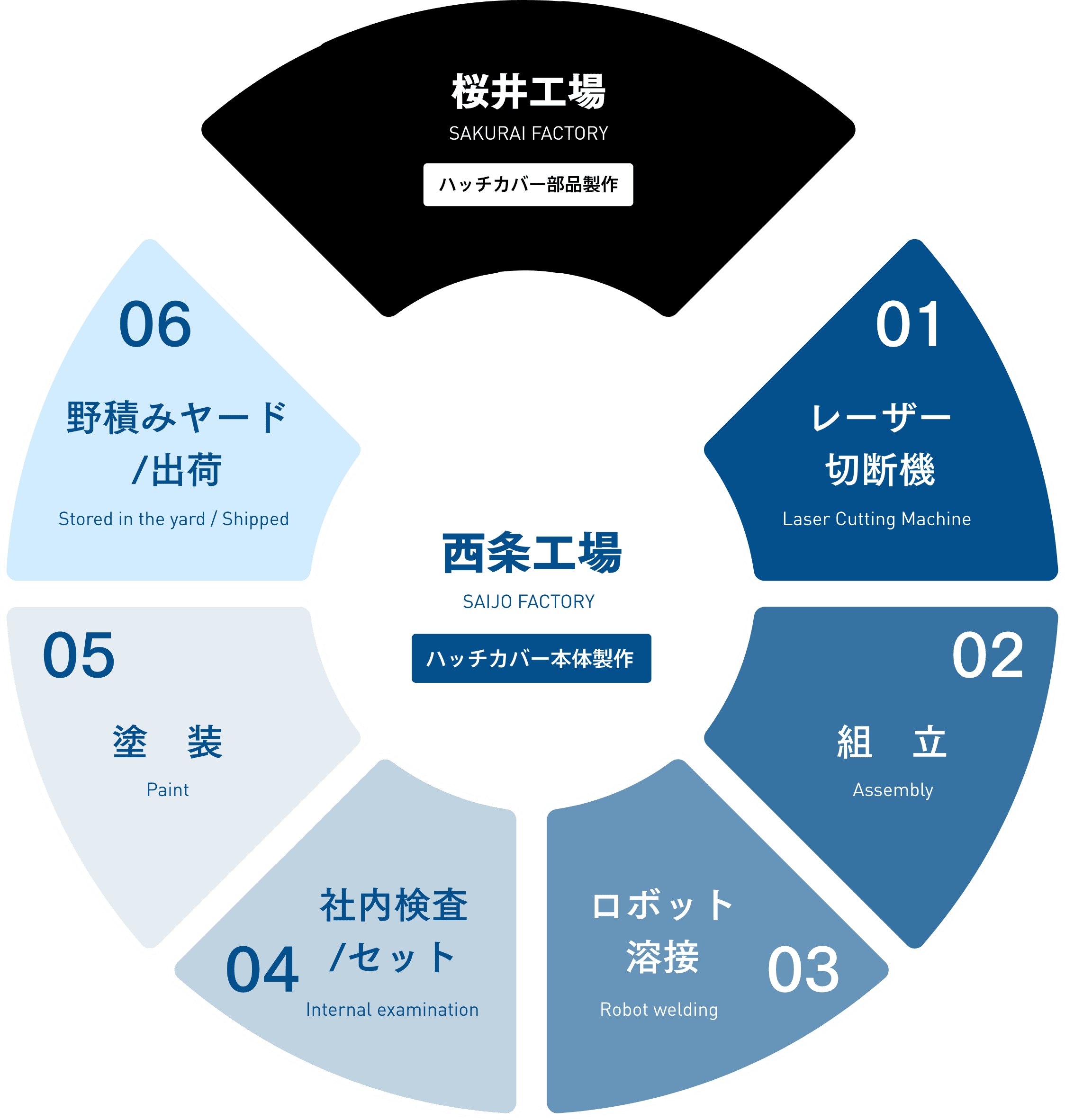 西条工場では、桜井工場で自社製作した各種パーツを含め、資材搬入から、切断・溶接・組立・検査・塗装・製品搬出に至るまでを、作業性に優れた独自のUライン体制にておこない、ハッチカバー及び各種製品を完成させています。